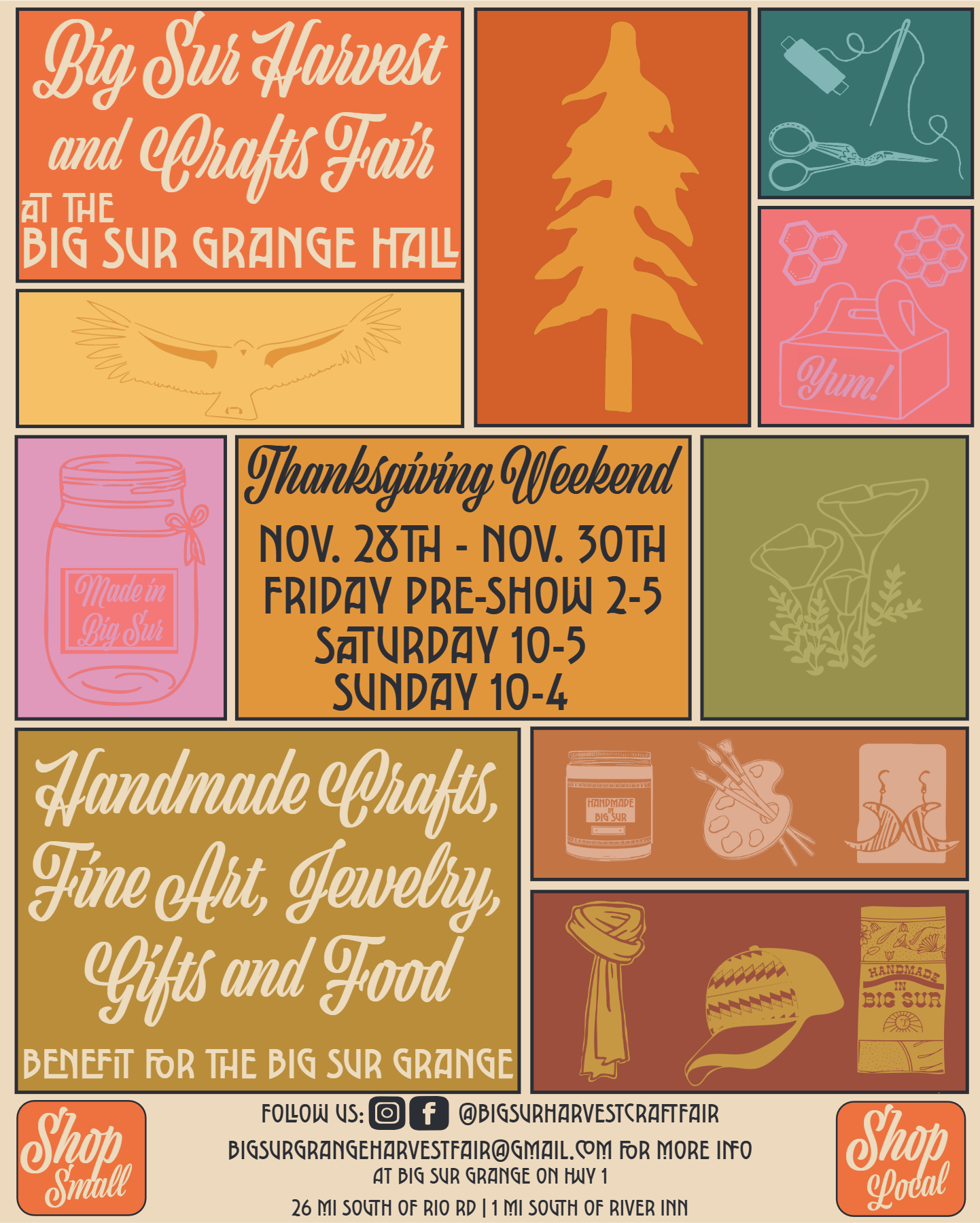 The Big Sur Harvest and Crafts Fair at the Big Sur Grange is held every year on Black Friday weekend! We’ll be vending here for our third year in a row! 10% off all sales benefits the Big Sur Grange. I’ll provide you with a tarot reading upon request!